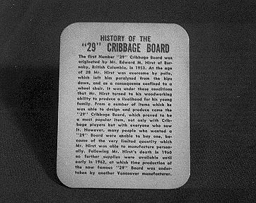 Many variations to the "29" board have been manufactured all over the world, but most people are not aware of how or by whom the design was first created. Once upon a time, in Burnaby British Columbia, lived a man called Edward M. Hirst. Mr. Hirst was overcome by polio when he was 28 years old and spent the rest of his life in a wheelchair. He was an avid woodworker, and in 1953 he designed the first "29" board. From that point on until his death in 1960, he was kept busy trying to keep up with the demand for this very popular and uniquely designed board. It has been said that folks would wait months for their order to be filled, because he hand-crafted every board by himself. The fact that the board wasn't mass-produced until after his death, indicates that Mr. Hirst may have had the foresight to register his design. A firm located in Vancouver, quite possibly Ryco Sales Ltd., began mass producing the board in 1962, two years after Mr. Hirst's death. The history of the "29" board might have been lost forever but for the fact that another Canadian company, Somerville Industries, attached a card with its' history to the "29" board (called 'THE PERFECT CRIBBAGE BOARD') that they manufactured. (See photos) Not long after Somerville began producing the board, in 1964, the company was purchased by Milton Bradley Co. of Springfield, MA. It doesn't appear that Milton Bradley ever continued its' production. Somerville and Ryco are the only known Canadian manufacturers of the "29" board, and both companies featured the 5 of Diamonds as the cut card.