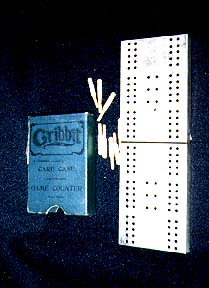 The Gribbit board is of very simple construction, a hollow metal shell which holds a deck of playing cards and pegs when folded. The cards can be removed without unfolding the board, adding to the simplicity of design. Although its origin hasn't yet been determined, at least two of the boards have recently surfaced in upper New York state, leading me to suspect that the manufacturer was located in that area. The case and board appear to be early 20th Century, but could possibly be earlier, as it was called a Game Counter. It was popular for the game boards of the Victorian era to be used for scoring in multiple games such as Gin Rummy, Pinochle, Dominoes, Whist, Bezique, and of course Cribbage. I have discovered that Patents from the 19th Century more commonly refer to cribbage boards as game counters, game boxes, game boards and game tables. The Gribbit is marked "Pat Pend'g", but one hasn't surfaced yet. By the way, this board measures 4" X 2 12" X 5/8" when folded.