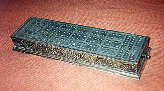 Over the past several years, reports of this cribbage board have surfaced from throughout the country. In fact, it would seem as though it may have been made available through a catalog at one time, as the reports aren't localized. The ACC photo gallery recently contained a photo of this board, but the one shown contained a drawer for card storage (the only one reported thus far with this feature). The bottom of the Monogram Cribbage Board is stamped "Pat.Mar.8.92" (1892). My board is also stamped "14" at one corner. The face of the wooden board contains a silver plated central scroll which features the initials "MBC" as well as two wheels used for counting up to 10 Games Won in cribbage or for counting other games such as mentioned in the section about the Gribbit. The Double Five holes are also enclosed separately in silver plated rectangles. The box reveals no other information about the manufacturer.