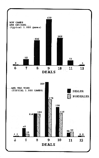 The chart analyzes the number of deals in a typical cribbage game, and who has the advantage (the dealer or the non-dealer). The chart shows that a nine-deal game is by far the most common (about 42% of all games are played in nine deals). The lower chart shows that the dealer wins about 19% more than the non-dealer (250-170) in a nine-deal game. It also shows that about 90% of all games are played in eight, nine or ten deals. In an average game, the non-dealer comes up about five points short, and the dealer wins, usually by counting his/her crib to win the game. By using the Twenty-six Theory as your guide, you can cut the dealer's ninth deal advantage.